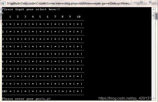 - 当输入坐标对应点有雷时,炸“死”,游戏结束。当剩下未选中的点的个数等于总共布下的雷的个数时,游戏胜利。