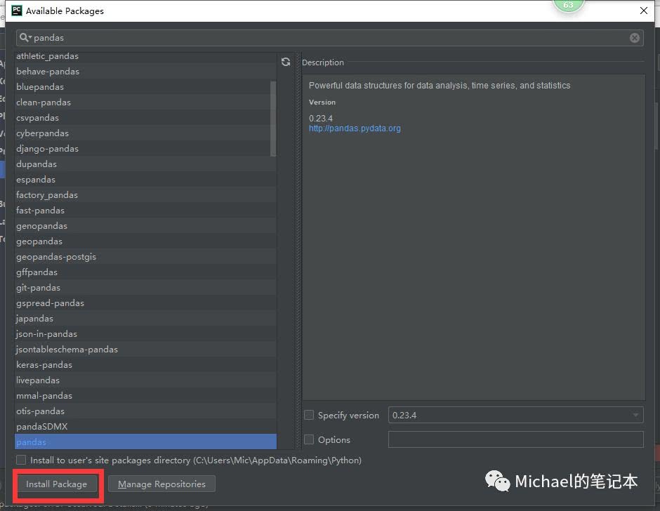 在搜索框中搜索pandas,点击Install Package,等待安装完成即可,如下图: