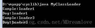为了验证这一点,可以吧D:\myapp\serverlib目录下Dog.class文件删除,然后在D:\myapp\syslib目录下存放一个Dog.class文件,此时打印结果如下: