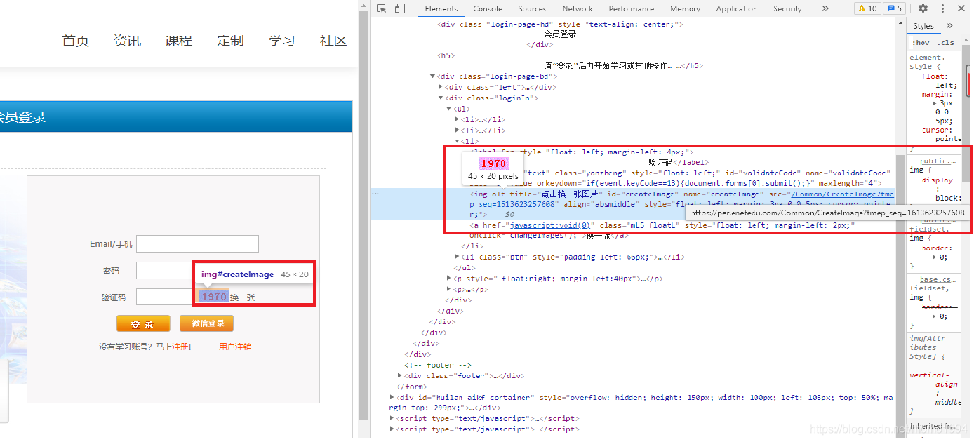 第一步:首先查看验证码对应的代码,可以从图中看到验证码图片的地址是:https://per.enetedu.com/Common/CreateImage?tmep_seq=1613623257608