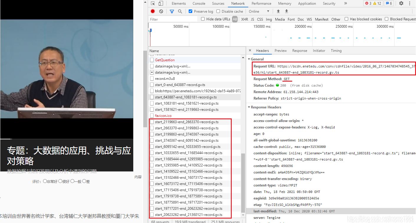 登录成功后,检查视频播放div对应的代码,企图找到视频地址直接保存至本地。结果,如下图所示,整个视频是被分割成一段一段的.ts文件,分段加载到页面中播放。GET每段视频的地址为右侧红框圈起来的部分。