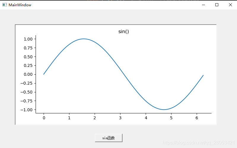 我们使用QGraphicsView插件来显示Matplotlib里绘制的图片。这里演示的功能为:打开时界面默认绘制 cos函数的图像,点击按钮后,绘制sin函数的图像。