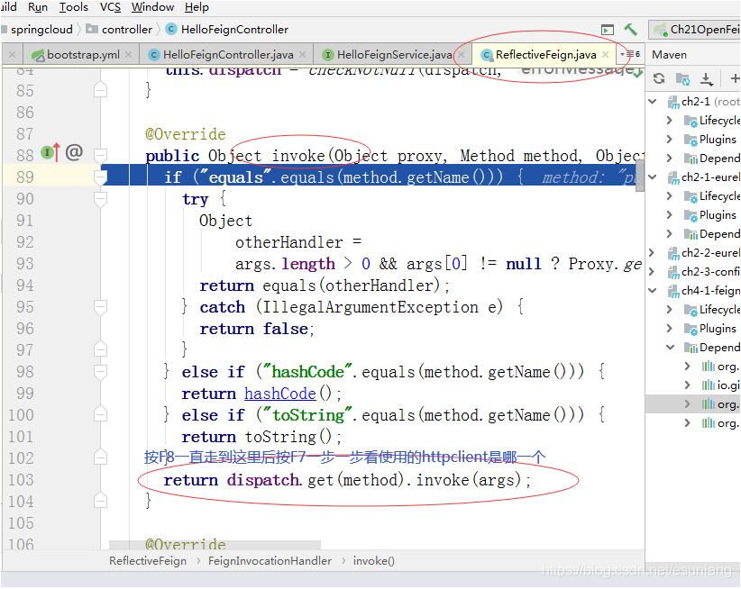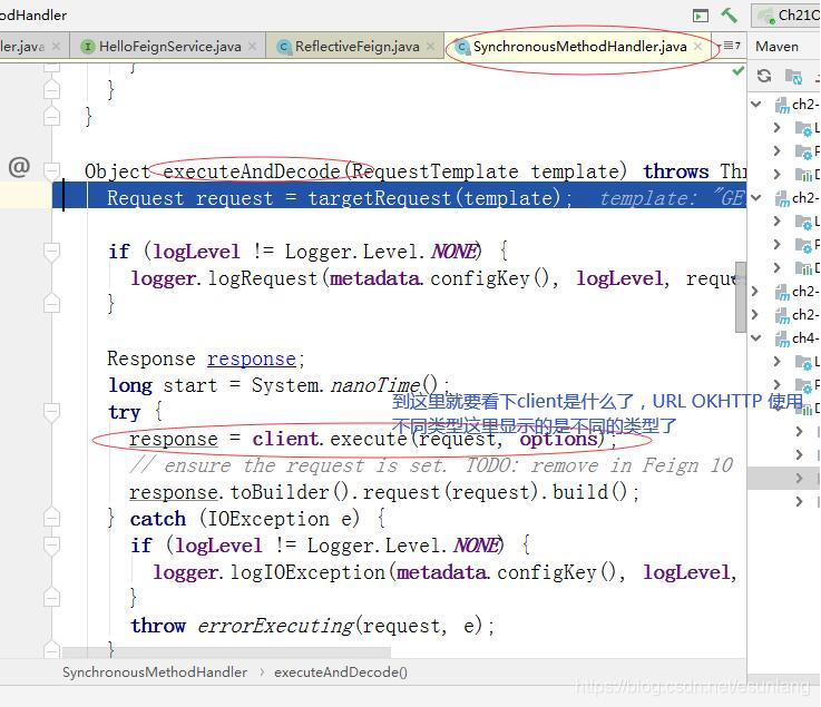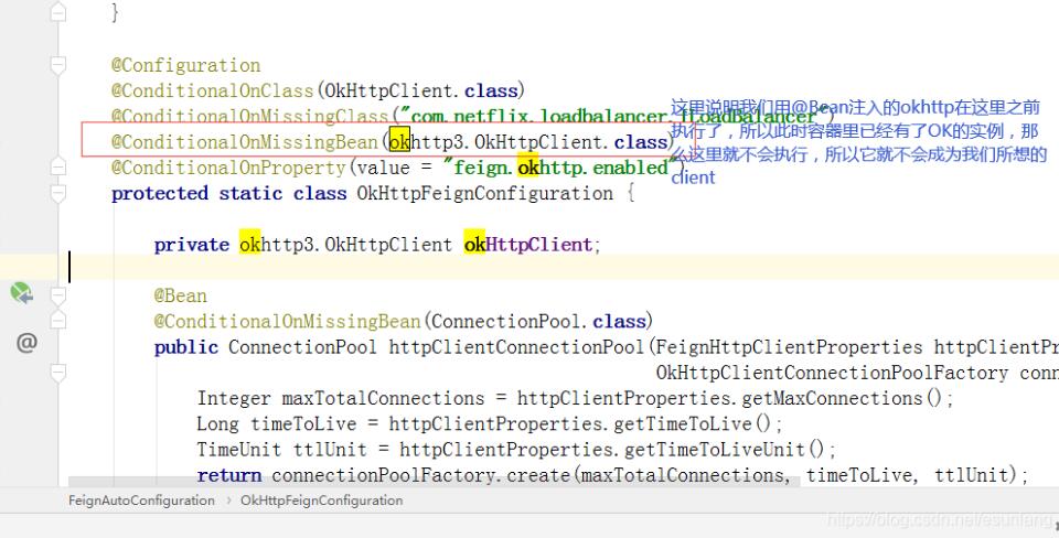 这个要再多看下创建流程,从代码上分析,这时在有new feign.okhttp.OkHttpClient(client); 这一段代码,重新把okhttp注入后,才使得feignClient 名称对应的bean为okhttp。不防从以下代码进行分析:
