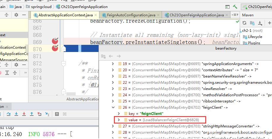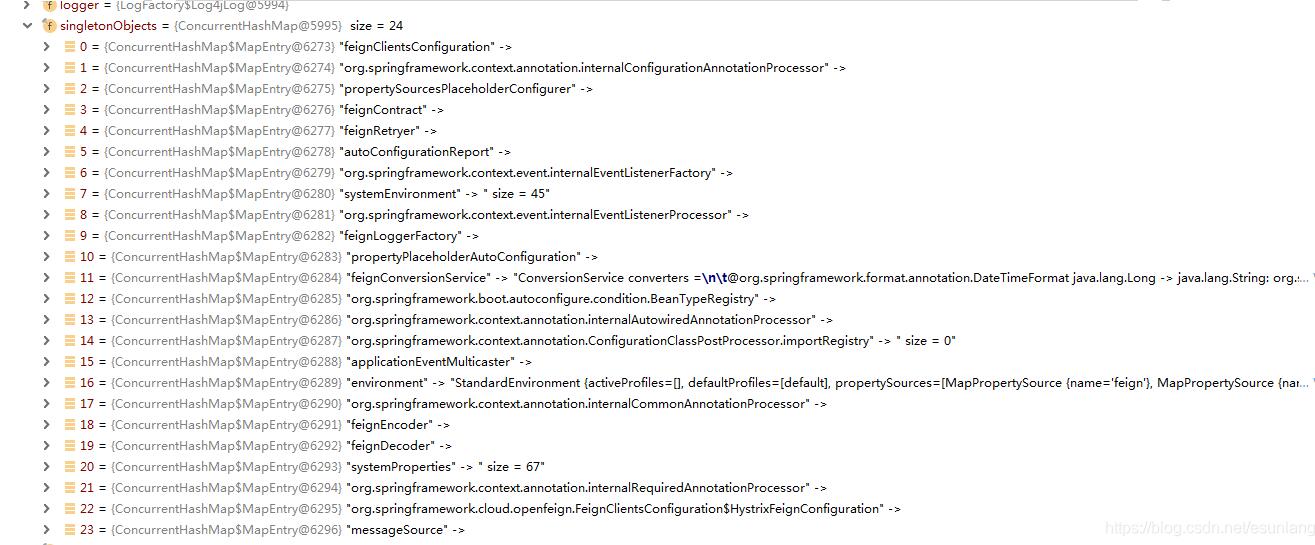 启动springboot项目时,BEAN容器化时机不同导致得不到想要的client,在启动项目时,org.springframework.cloud.openfeign.FeignAutoConfiguration这个配置类是执行后。在BEAN装载时看到BEAN一级缓存如下图,并没有OKHTTP相关的信息。