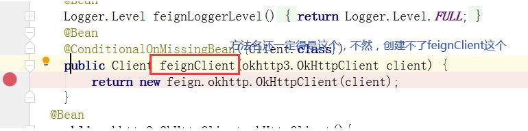 在主类添加的方法用来创建okhttp时,方法名一定要写成下图的这样,不然创建不了feignClient这个bean。