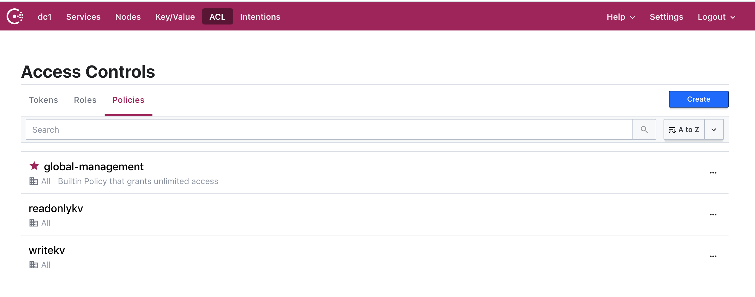 通过浏览器访问consul,点击ACL -> Access Controls -> Policies -> 右上角Create创建一个只读“upstreams”kv策略,名称为:readonlykv,Rules内容为: