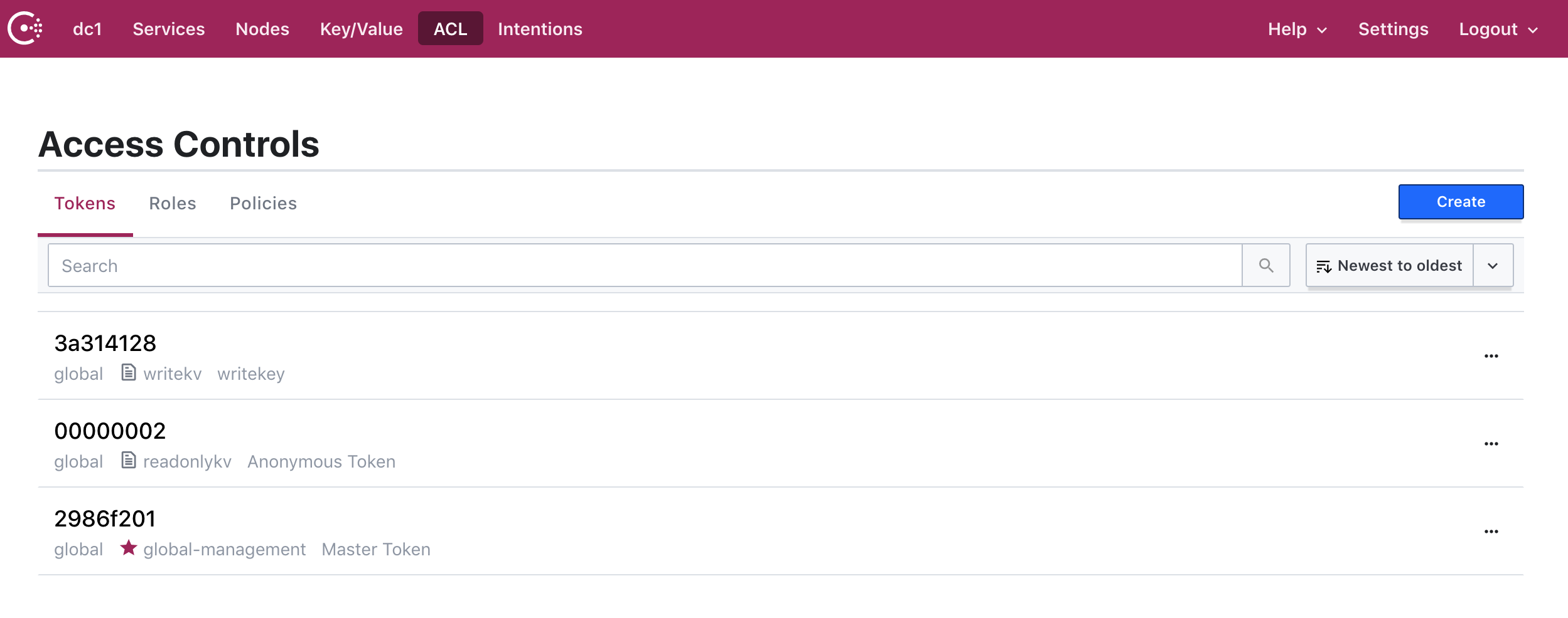 通过浏览器访问consul,点击ACL -> Access Controls -> Tokens -> 右上角Create,在Policies中选择writekv。