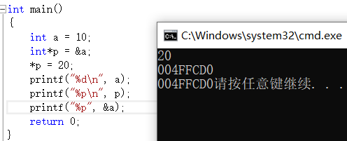 地址用%p打印,用十六进制表示,在打印时候输入指针变量p和取地址a得出的结果是相同的,证明了指针是用来存放地址的。