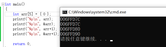 上图显示出&arr和arr的不同,虽然起始地址相同,但arr+1只让指针向后移动了一个元素的空间,而&arr+1让指针移动了一个数组的空间。