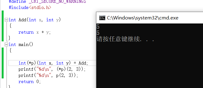 用函数指针调用函数时可以不加*这个解引用符号,因为这个符号将不会在程序运行的时候起到作用。