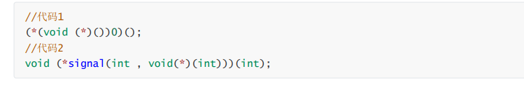 代码1中间的 void(*)()是一个函数指针类型,将这个函数指针类型放在括号中,是强制类型转换的意思也就是把0强制转换成一个函数指针,强制类型转换这个部分简单写出来就是“(函数指针)0”是将0作为一个函数的地址,而最外层的括号(*函数的地址)()这个是解引用操作,也就是通过0这个地址,找到了0地址处所在的函数,并且进行调用。