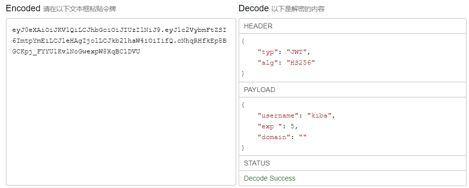 JWT的Code与解析后的内容如下图所示,左边未Code,右边未解析的内容。