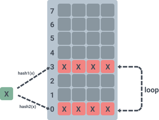 上图展示了元素 X 在插入到 hash 表的时候,hash 两次发现对应的槽位 0 和 3 都已经满了,那么随机抢占了槽位 3 其中一个元素,被抢占的元素重新 hash 之后插入到槽位 5 的第三个位置上。