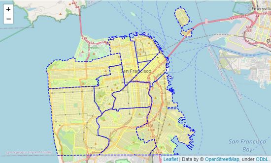 import json import requests # url = 'https://cocl.us/sanfran_geojson' url = 'san-francisco.geojson' san_geo = f'{url}' san_map = folium.Map(location=[37.77, -122.42], zoom_start=12,width='50%',height='50%') folium.GeoJson( san_geo, style_function=lambda feature: { 'fillColor': '#ffff00', 'color': 'blue', 'weight': 2, 'dashArray': '5, 5' } ).add_to(san_map) san_map