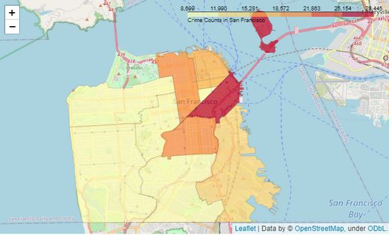# Count crime numbers in each neighborhood disdata = pd.DataFrame(cdata['PdDistrict'].value_counts()) disdata.reset_index(inplace=True) disdata.rename(columns={'index':'Neighborhood','PdDistrict':'Count'},inplace=True) san_map = folium.Map(location=[37.77, -122.42], zoom_start=12,width='50%',height='50%') folium.Choropleth( geo_data=san_geo, data=disdata, columns=['Neighborhood','Count'], key_on='feature.properties.DISTRICT', #fill_color='red', fill_color='YlOrRd', fill_opacity=0.7, line_opacity=0.2, highlight=True, legend_name='Crime Counts in San Francisco' ).add_to(san_map) san_map