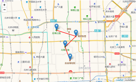 folium.Marker([39.917834,116.397036], popup='故宫').add_to(m) folium.Marker([39.928614,116.391746], popup='北海公园').add_to(m) folium.Marker([39.937282,116.403187], popup='南锣鼓巷').add_to(m) folium.Marker([39.942143,116.382590], popup='后海公园').add_to(m) folium.Polygon([ [39.917834,116.397036], [39.928614,116.391746], [39.942143,116.382590], [39.937282,116.403187], ],color='blue', weight=2, fill=True, fill_color='blue', fill_opacity=0.3).add_to(m)