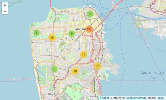 import folium import pandas as pd san_map = folium.Map(location=[37.77, -122.42], zoom_start=12,width='50%',height='50%') # cdata = pd.read_csv('https://cocl.us/sanfran_crime_dataset') cdata = pd.read_csv('Police_Department_Incidents_-_Previous_Year__2016_.csv') #犯罪数据,包含犯罪所在经纬度 # get the first 200 crimes in the cdata limit = 200 data = cdata.iloc[0:limit, :] # Instantiate a feature group for the incidents in the dataframe incidents = folium.map.FeatureGroup() # Loop through the 200 crimes and add each to the incidents feature group for lat, lng, in zip(cdata.Y, data.X): incidents.add_child( folium.CircleMarker( [lat, lng], radius=7, # define how big you want the circle markers to be color='yellow', fill=True, fill_color='red', fill_opacity=0.4 ) ) san_map.add_child(incidents)