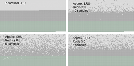左上角第一幅图代表的是传统 LRU 算法,可以看到,当抽样数达到 10 个(右上角),已经和传统的 LRU 算法非常接近了。