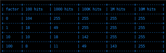 公式中的 lfu_log_factor 称之为对数因子,默认是 10 ,可以通过参数来进行控制: