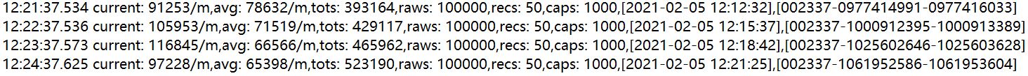实时任务运行后,在日志窗口输出MySQL数据库日志解析信息,包含每分钟读取的日志记录,最近解析日志时间点。