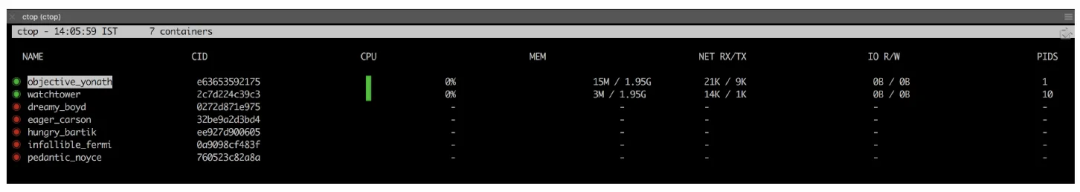 你可以运行 ctop 命令,查看所有容器的状态。