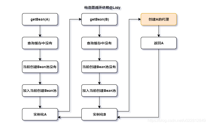 在上面的例子中只需要在SingleConstrutorBeanA或者SingleConstrutorBeanB的构造方法上面加上@Lazy注解,就会发现不会抛出异常了,这又是为什么呢?