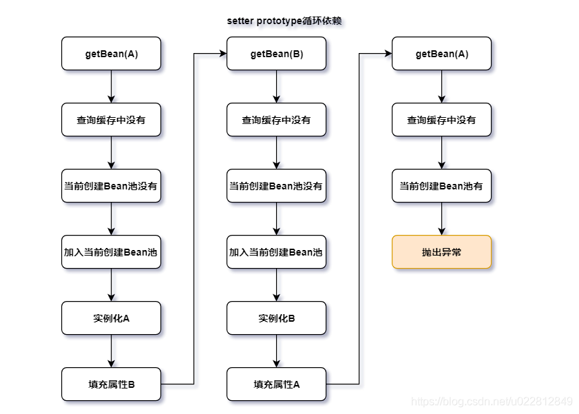 对于prototype作用域bean,Spring容器无法完成依赖注入,因为Spring容器不进行缓存"prototype"作用域的bean,因此无法提前暴露一个创建中的bean。