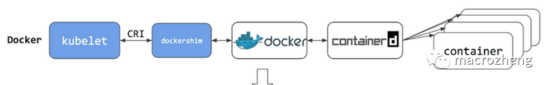 如果你使用Docker作为K8S容器运行时的话,kubelet需要先要通过 dockershim 去调用Docker,再通过Docker去调用containerd。