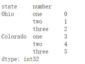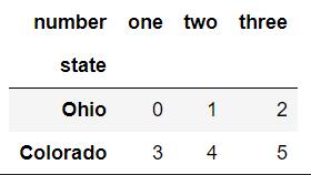 data = pd.DataFrame(np.arange(6).reshape((2,3)),index=pd.Index(['Ohio','Colorado'],name='state')