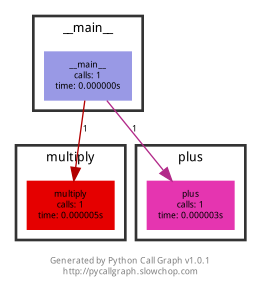 这个案例的功能,仅仅是把加法和乘法进行了函数的封装,再在main函数中调用,执行结果和pycallgraph生成的图片如下图所示: