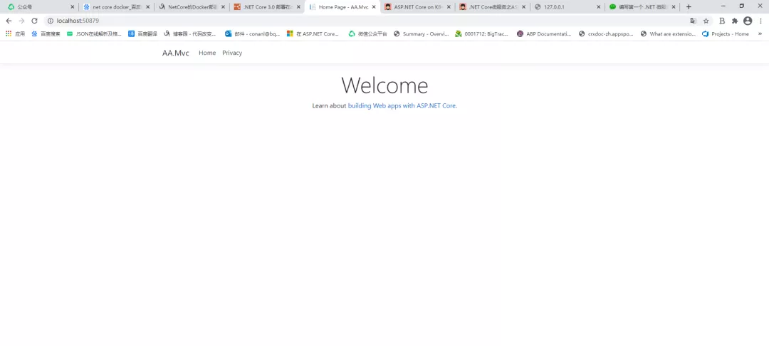 最后一个参数 core-mvc 就是我们刚创建的镜像名称,经过以上4个步骤,在浏览器中输入地址http://localhost:50879/查看如图