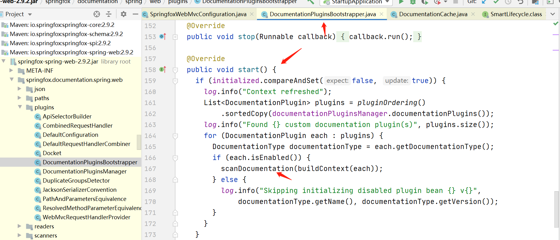 通过调试可以找到swagger2就是通过实现了SmartLifecycle接口的DocumentationPluginsBootstrapper类,当spring容器加载所有bean并完成初始化之后,会回调实现该接口的类(DocumentationPluginsBootstrapper)中对应的方法start()方法,下面会介绍怎么找到这里的。