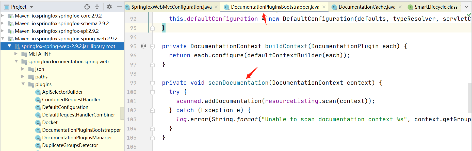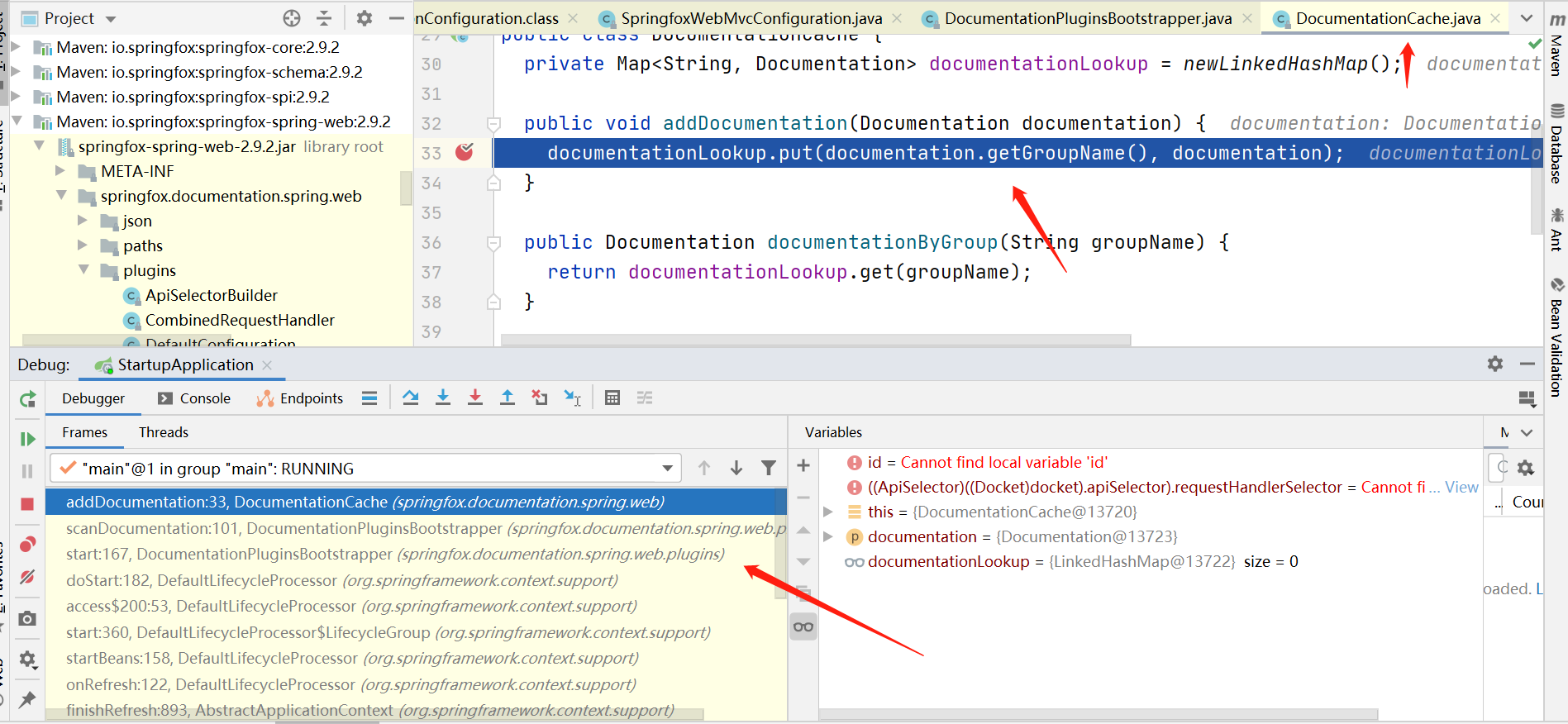 ‘如果找不到解决问题的入口,我们至少可以找到访问文档的上面这个接口地址(出口),发现接口返回的文档json内容是从DocumentationCache里获取,那么我们很明显可以想到肯定有地方存放数据到这个DocumentationCache里,然后其实我们可以直接在addDocumentation方法里打个断点,然后看调试左侧的运行方法栈信息,就可以很明确的看到调用链路了