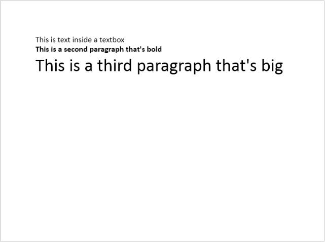 from pptx import Presentation from pptx.util import Inches, Pt prs = Presentation() blank_slide_layout = prs.slide_layouts[6] slide = prs.slides.add_slide(blank_slide_layout) left = top = width = height = Inches(1) txBox = slide.shapes.add_textbox(left, top, width, height) tf = txBox.text_frame tf.text = "This is text inside a textbox" p = tf.add_paragraph() p.text = "This is a second paragraph that's bold" p.font.bold = True p = tf.add_paragraph() p.text = "This is a third paragraph that's big" p.font.size = Pt(40) prs.save(r'd:\temp\test1.pptx')