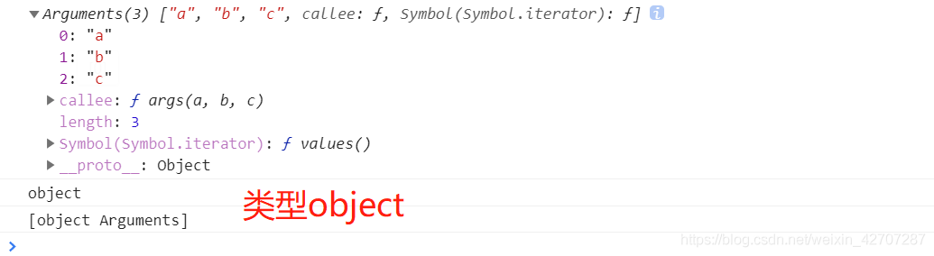 可以看出,arguments包含所有参数,并且存在length属性,同时可以看出,他的类型是object,并且转换为string后 是 object Arguments,代表是Arguments对象。同时,可以看到,他还有一个属性callee,而这个属性的值好像就是我们定义的这个函数体,那么我们输出看一下