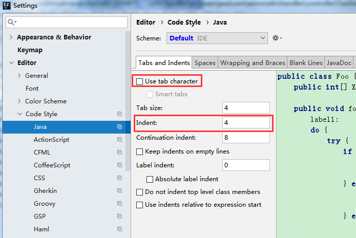 一、选择File→Settings→Editor→Code style→Java,再点击右边的Tabs and Indents。