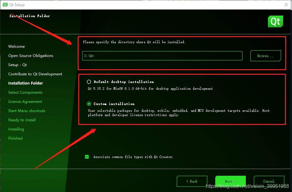 3.【安装目录】按照个人安装习惯选择常用路径,并选择“自定义安装”,这样后续就能安装 Qt6 ,个人建议安装在系统盘