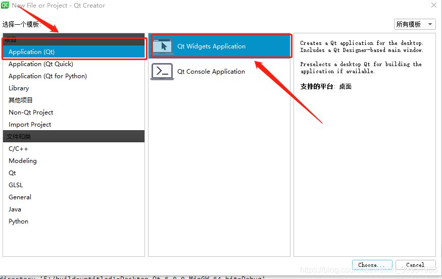 在 Qt 安装完成之后,一测试环境是否可用。新建一个项目,选择 Qt 界面程序