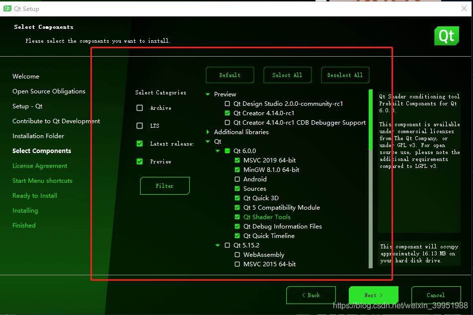 4.【选择组件】勾选 Qt 6.0.0,勾选需要安装的组件,但 MSVC 和 MinGW 至少选择一种。