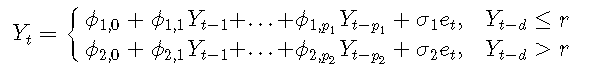 为简单起见,除了假设p1 = p2 = p,1≤d≤p,还假设σ1=σ2=σ。然后可以将TAR模型方便地写为