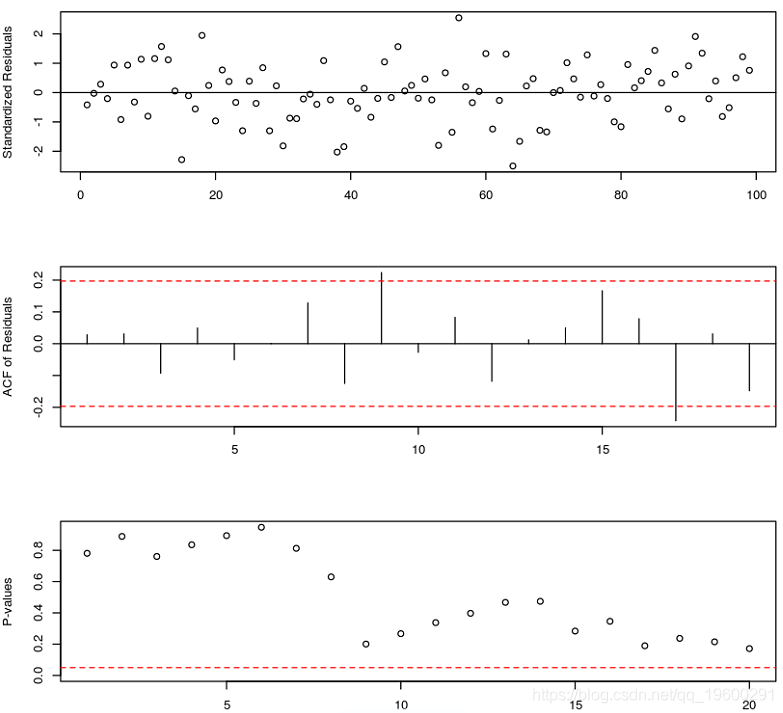 如果TAR模型是真正的数据机制,则标准化残差图应看起来是随机的。可以通过检查标准化残差的样本ACF来检查标准化误差的独立性假设。