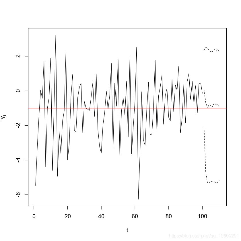 lines(ts(model.tar.pred$pred.interval[2,], start=end(y) + c(0,1), freq=1), lty=2)