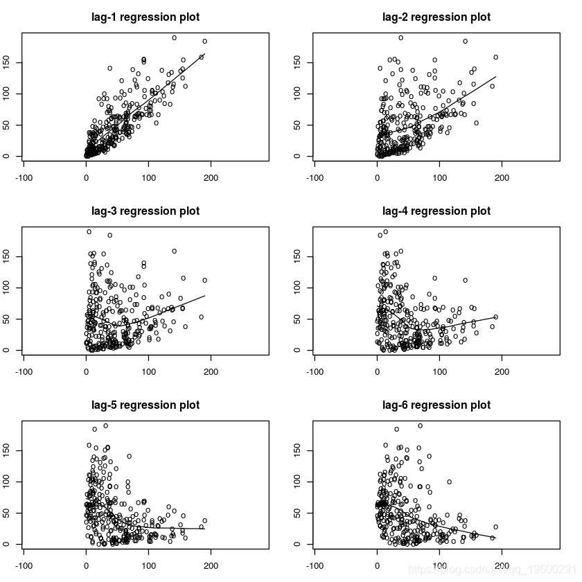 绘制Yt与其滞后。拟合的回归曲线不是很直,可能表明存在非线性关系。