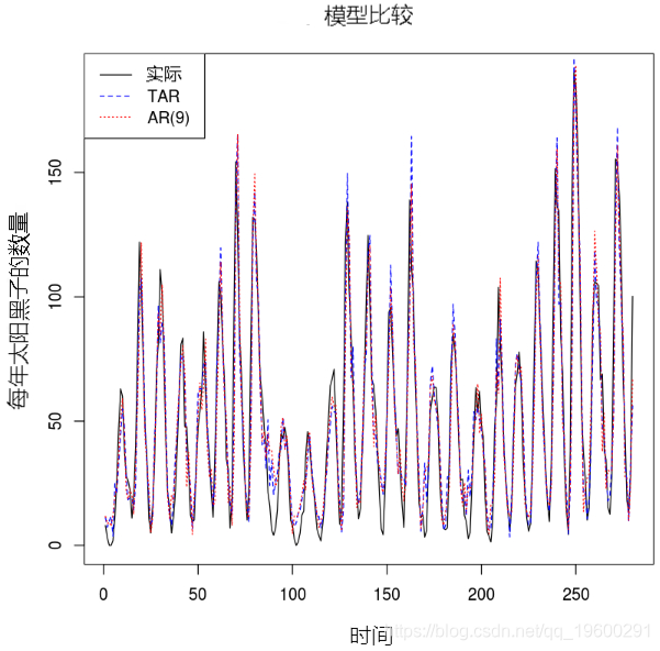 为了方便起见,这些模型通常简称为TAR模型。这些模型捕获了线性时间序列模型无法捕获的行为,例如周期,幅度相关的频率和跳跃现象。Tong和Lim(1980)使用阈值模型表明,该模型能够发现黑子数据出现的不对称周期性行为。