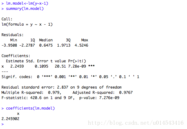 结果可以发现,两者的结果是一样的,并无区别,但是若改为lm(y~x-1)就能看出+1和-1的差别在哪了,测试结果如下: