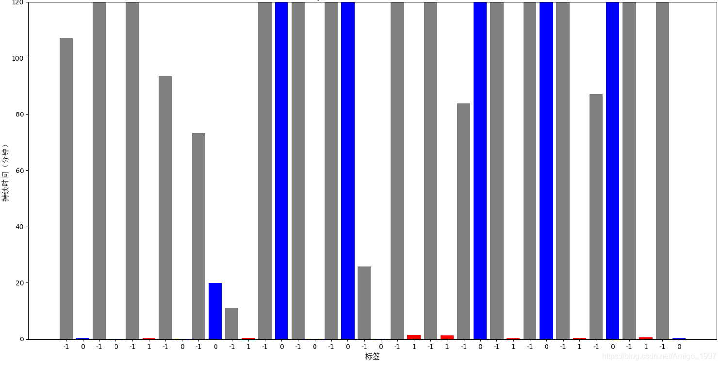 临床数据的记录时间和对应标签(逗号后面的数字)记录在txt文件里,要把标签转换为3类标签,并且计算出每个标签的分别持续时间,然后绘制成柱形图方便查阅。