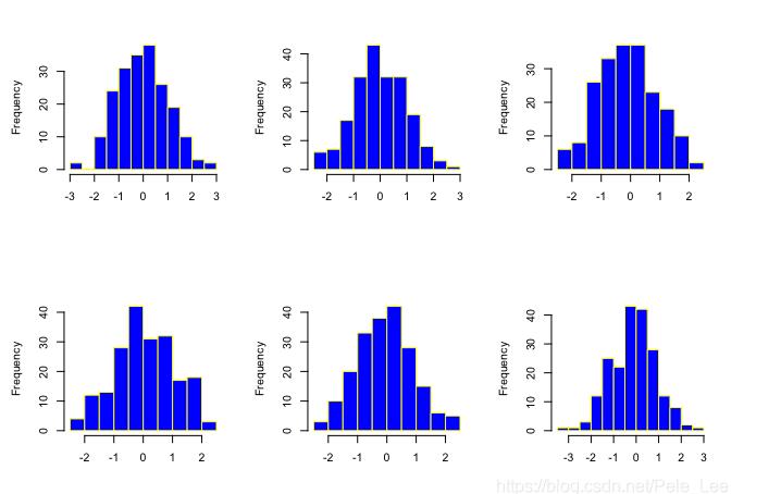 for (i in 1:6) {hist(rnorm(200),border='yellow',col='blue',main='',xlab='')}