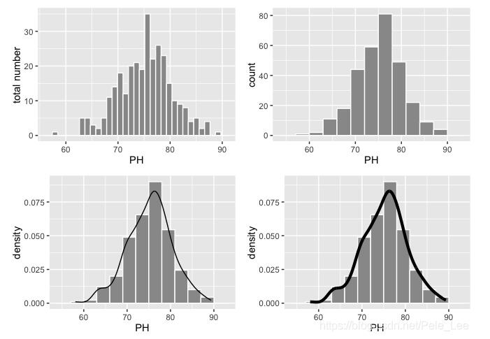 p4<-ggplot(data=PH,aes(PH,..density..)) geom_histogram(color='white',fill='gray60',binwidth = 3) geom_line(stat='density',size=1.5) grid.arrange(p1,p2,p3,p4)