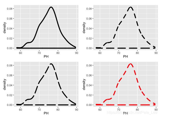 p4<-ggplot(data=PH,aes(PH,..density..)) geom_density(size=1.5,linetype=2,colour='red') grid.arrange(p1,p2,p3,p4)