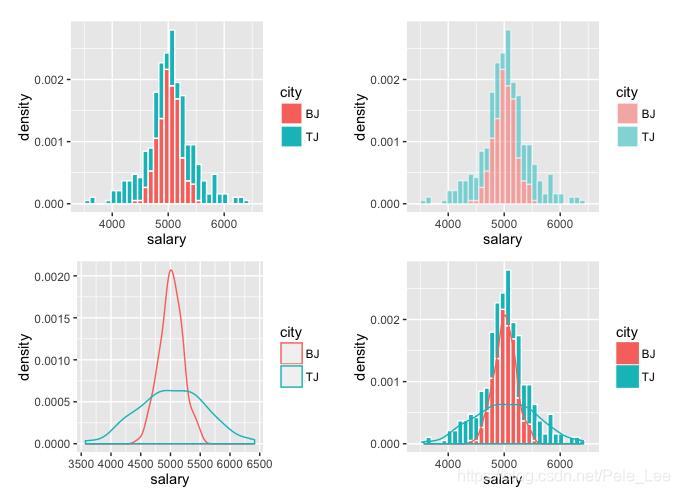 library(ggplot2) p1<-ggplot() geom_histogram(data=df,aes(salary,..density..,fill=city),color='white') p2<-ggplot() geom_histogram(data=df,aes(salary,..density..,fill=city),color='white',alpha=.5) p3<-ggplot() geom_density(data=df,aes(salary,..density..,color=city)) p4<-ggplot() geom_histogram(data=df,aes(salary,..density..,fill=city),color='white') geom_density(data=df,aes(salary,..density..,color=city)) grid.arrange(p1,p2,p3,p4)